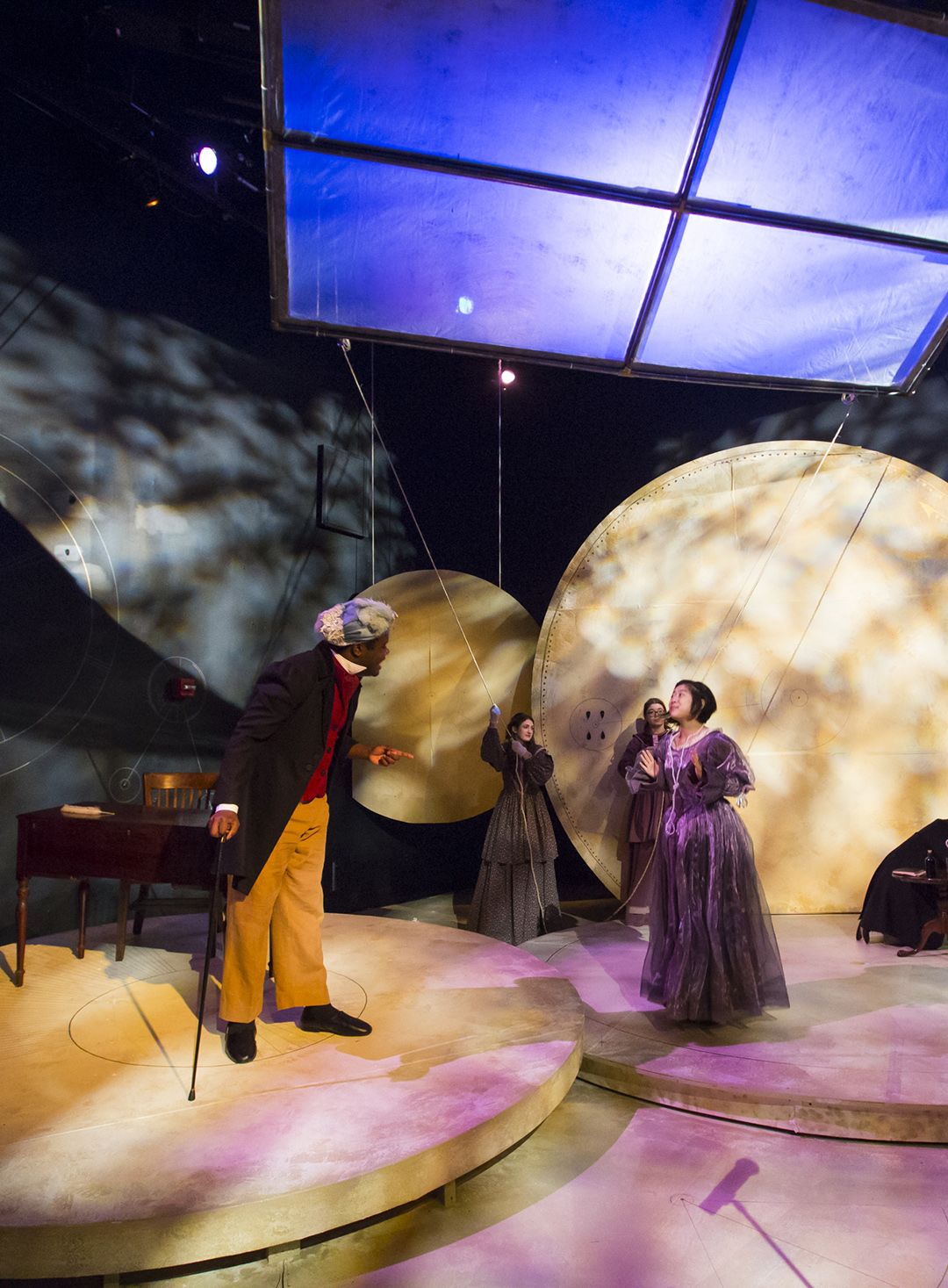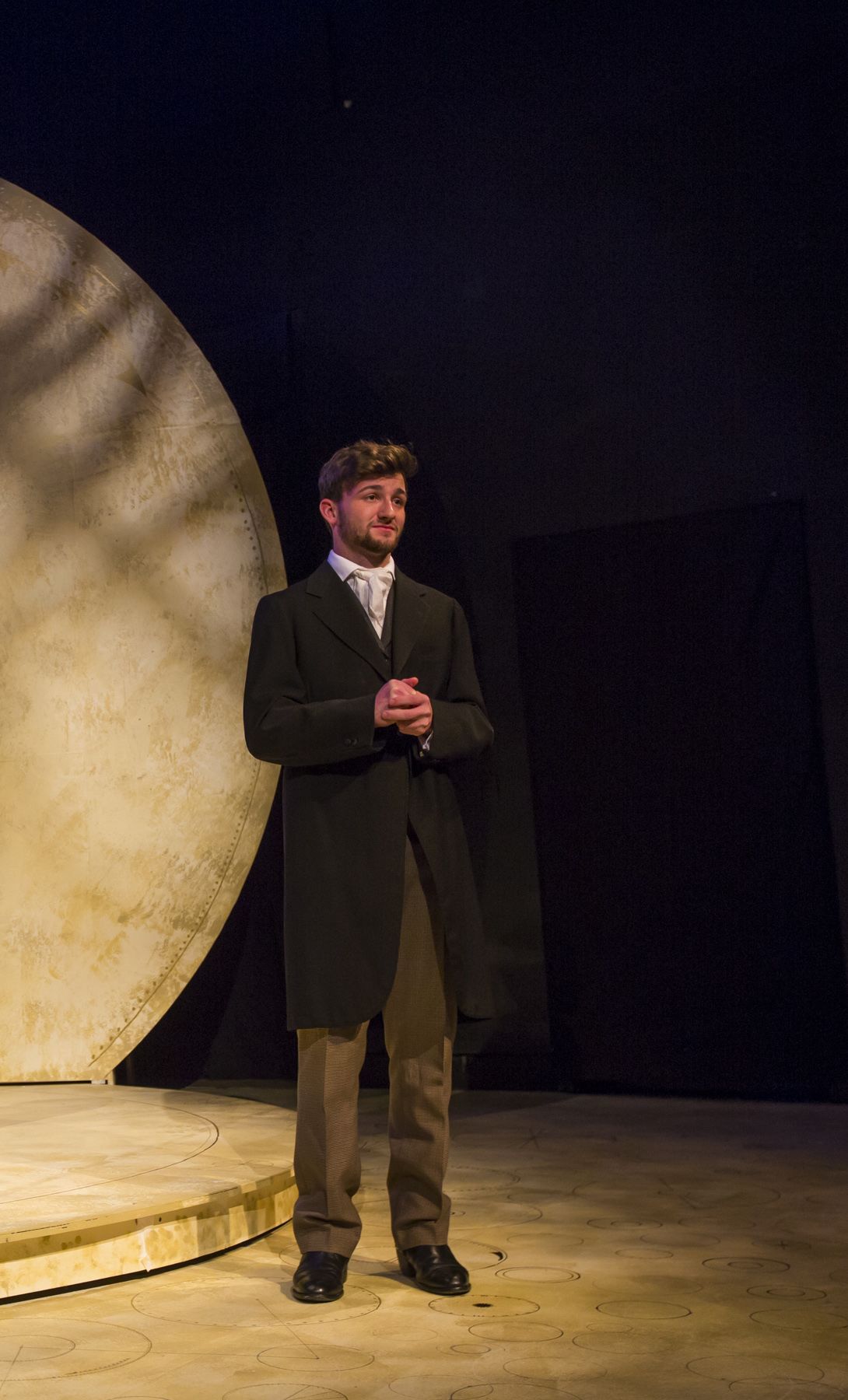 The crew turned the Tarbutton stage into a machine for producing a theatrical experience — a “memory engine.” The set draws inspiration from Babbage’s initial drawings for the analytical engine, the prototype for the modern computer. If the analytical engine had been built in Babbage’s lifetime, it would have been fully mechanical, tremendous in size, and used many interlocking gears.